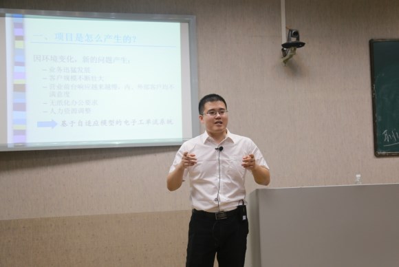 在讲座中,刘康先生结合自己在衡阳移动工作期间开发的项目——“基于自适应模型的电子工单流系统”,结合计算机专业的基础知识,生动地讲述了如何利用在大学所学的计算机知识做出一个适合工作实际需要的、稳定高速的系统。围绕项目是怎么产生的、问题要解决到什么程度、项目是如何完成的、如何运用计算机基础知识、投入使用后还会碰到什么、系统演示这六个要点,刘康先生与同学们讨论了计算机基础知识在项目开发中的具体应用,同时还和同学们分享了自己在大学学习和工作中的一些体会。在互动交流环节,同学们就专业学习、考研、系统设计等问题争相向刘主管提问,刘康先生结合自身的学习及工作经验耐心解答了同学们在专业课程的学习中的困惑。通过与嘉宾的面对面沟通交流,同学们对于计算机科学与技术专业知识的实际应用有了更深层次的了解。