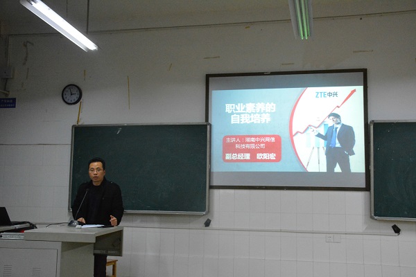 欧阳宏向在场师生介绍了中兴通讯有限公司的发展历程和在通讯领域取得的发展优势、中兴网信开拓湖南市场的经过及落地衡阳的原因,鼓励同学们要对通讯行业有充分的信心,做好充足的准备,要在未来代表中国通讯行业走出国门、走向世界。他同时也告诉大家,职场就是战场,以通讯领域领军企业中兴和华为为例,企业每年的考核非常严格,淘汰非常残酷,要在这样的竞争压力下实现适者生存,必须从现在开始就着力培养自己的职业素养。